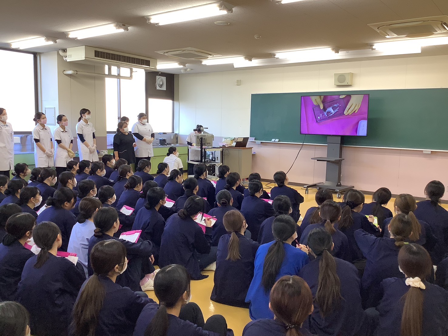 歯科衛生士科では、2・3年生の代表者10名が診療補助業務の患者誘導・印象採得・セメント練和と予防処置業務の歯石除去の4種目で競技し、技術および患者への対応力など様々な観点から総合評価を行いました。