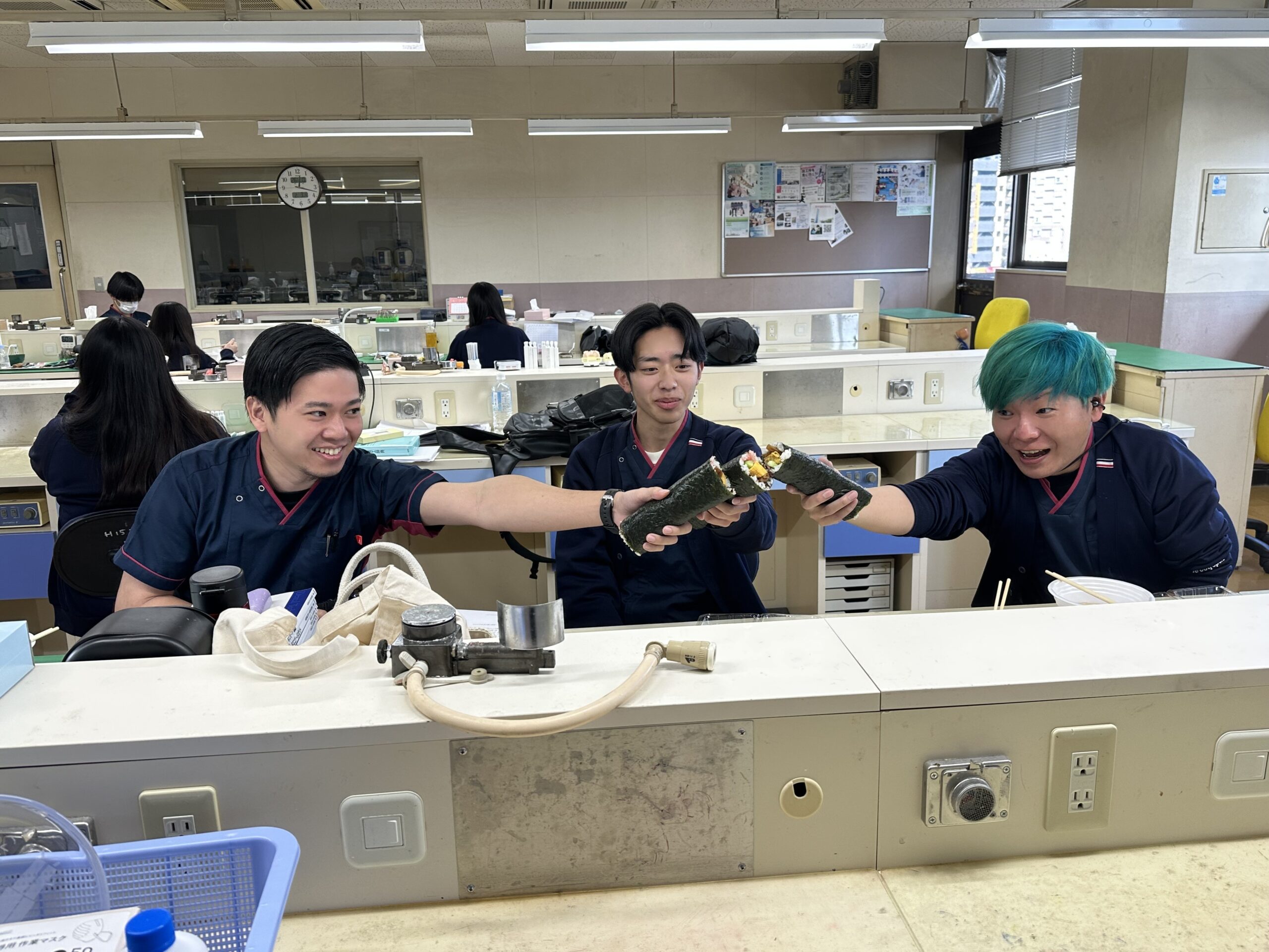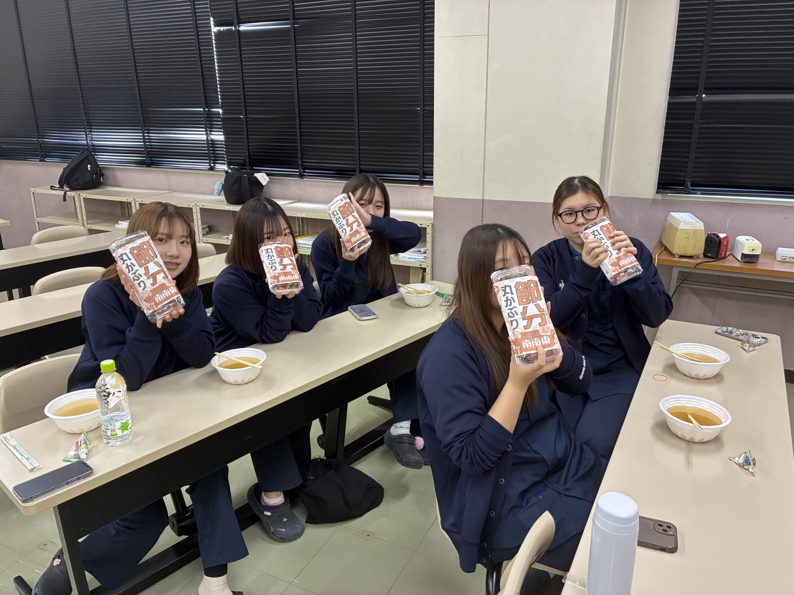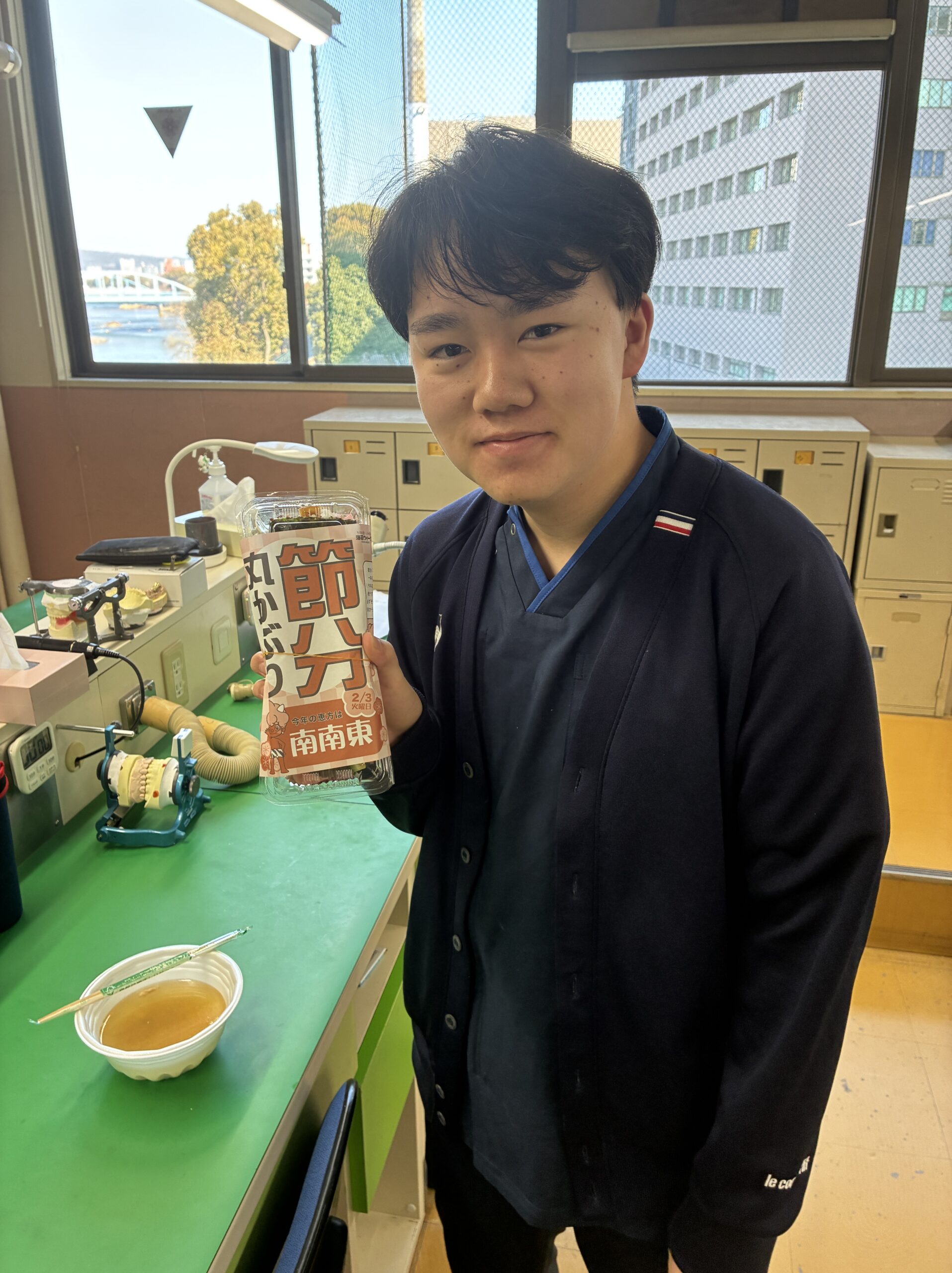 2026.02.04 在校生 NEW 節分の日👹 恵方巻🍣 今年の節分は2月3日👹 毎年恒例の「恵方巻」をいただきました!! 2026年の恵方方位は「南南東」です! 「南南東」を向いて、歯科技工士科・歯科衛生士科の学生が…パクり! 福を逃さないよう願いを込めてみんなで仲良くいただきます!!😋 今月15日には歯科技工士科の国家試験、来月の1日には歯科衛生士科の国家試験が控えてます! 風邪ひかず、全員合格目指して頑張りましょう💯 教職員一同応援しています🌟